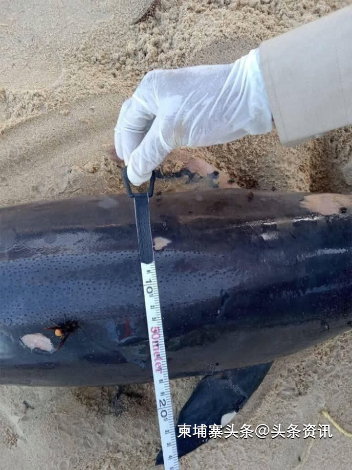 【柬埔寨头条综合报道】据柬埔寨国公省农林渔业局副局长指出,9月11日,国公省北赛村海滩发现一头海豚死亡。消息指出,这只海豚体长1.15米,宽2.3米,重约30公斤,颈部缠绕着绳索,头部有明显外伤。专家研判认为,该海豚是被渔网缠绕后遭受重创导致死亡。