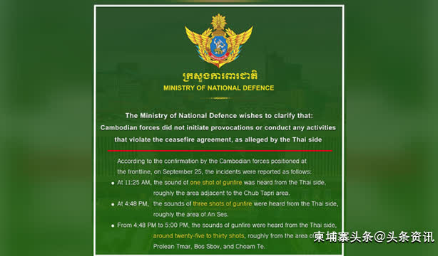 【柬埔寨头条综合报道】柬埔寨国防部发言人证实,据驻守前线的柬埔寨部队报告,9月25日再次听到来自泰国边境方向的枪声。根据该部的通告,事件发生经过如下: