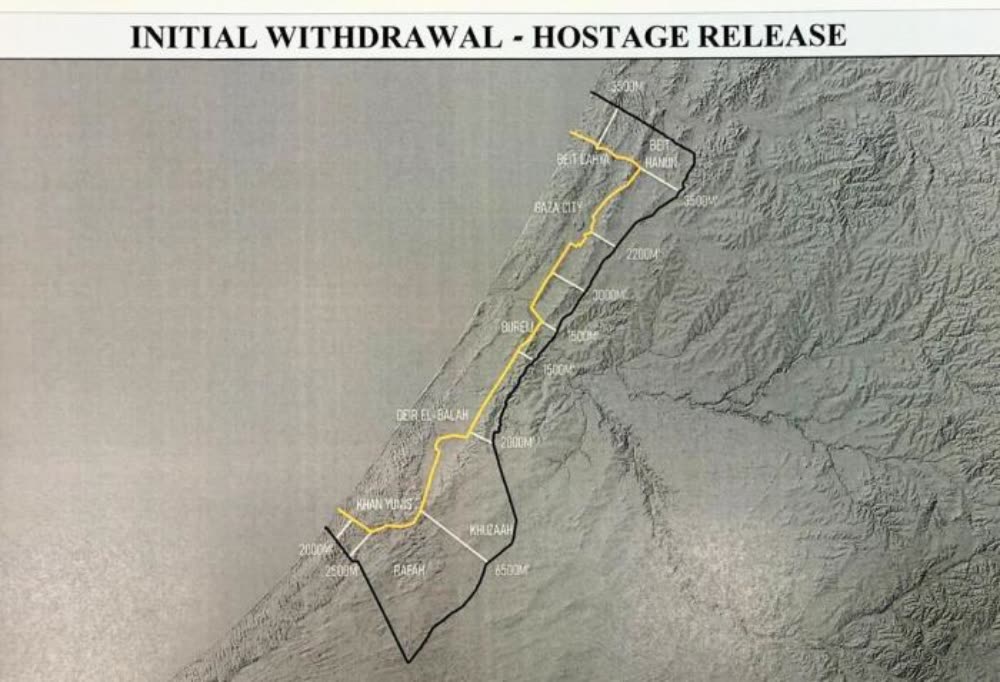 特朗普还在社交媒体上发布了一张用黄色标出以色列“初步撤军线”的加沙地带地图。