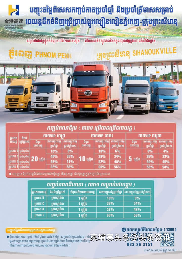 【柬埔寨头条综合报道】据柬媒消息,近日,金港高速公路公司正式推出货运车辆优惠套餐,包括年卡与季卡两种类型,为货运客户提供多项实用优惠,最高可节省达46美元/趟。