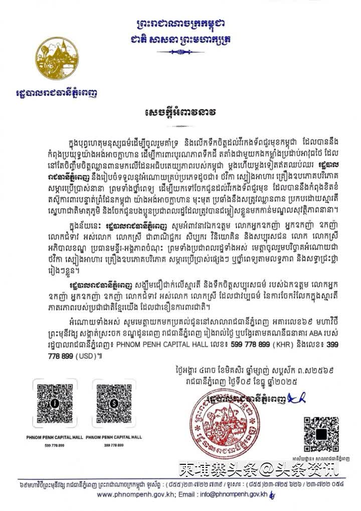 【柬埔寨头条综合报道】据柬媒消息,为支持正在英勇战斗、保卫领土完整的前线军队,以及援助撤离到安全中心的受影响民众,金边市政府正式公布捐款渠道,准备接收各类捐赠。 金边市政府呼吁各位大公爵、公爵、勋爵、企业家、慈善人士、政府单位以及广大民众,请根据各自的能力和慷慨之心,踊跃捐赠资金、粮食、生活用品以及各种物资及药品。 金边市政府强调,大家的慈善精神是高棉民族兄弟情谊中分享的文化,也是国防的基石。所有接收到的物资和资金将全部用于分发给前线军队和受影响民众。 民众可通过两种方式进行捐赠,物质可以直接送至金边市政府(地址:金边市隆边区沙拉佐分区莫尼旺大道69号大楼),每天均可接收。 或通过金边市政府ABA银行账户转账: •账户名称:PHNOM PENH CAPITAL HALL •瑞尔账户(KHR):599 778 899 •美元账户(USD):399 778 899。 (编译:影子) |