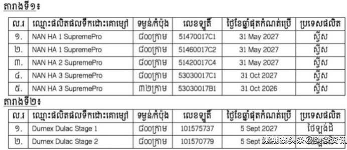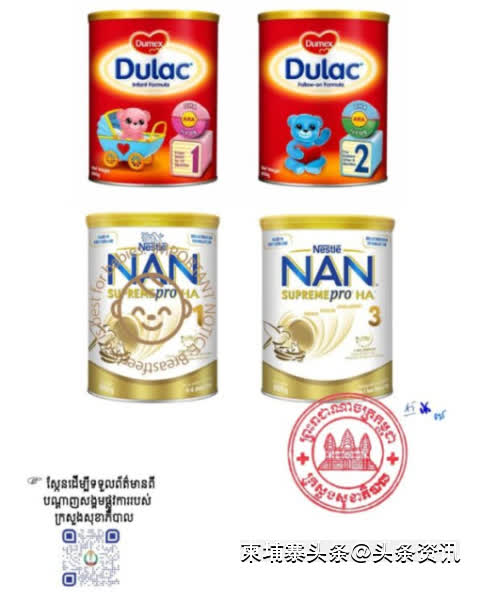 【柬埔寨头条综合报道】据柬媒报道,近日,柬埔寨卫生部发布声明,宣布召回可能含有蜡样芽孢杆菌毒素的奶粉产品。相关产品可能对婴幼儿、儿童及一般消费者的健康构成潜在风险。 卫生部指出,根据新加坡食品安全局发布的通告,涉及的奶粉品牌包括:NAN HA1 SupremePro、NAN HA2 SupremePro、NAN HA3 SupremePro,以及 Dumex Dulac Stage 1 和 Stage 2;具体产品编号详见相关公告。 不过,卫生部同时强调,上述问题奶粉并未由任何公司进口至柬埔寨市场。 尽管如此,为切实保障消费者的健康与安全,卫生部仍提醒公众、家长、监护人、企业经营者及相关机构,如发现、接触、正在使用、销售或分销上述产品,或发现婴幼儿因使用相关产品而出现不适症状,应立即与卫生部药品和医疗器械管理局取得联系,及时上交相关产品或获取进一步信息。(编译:安逸) |